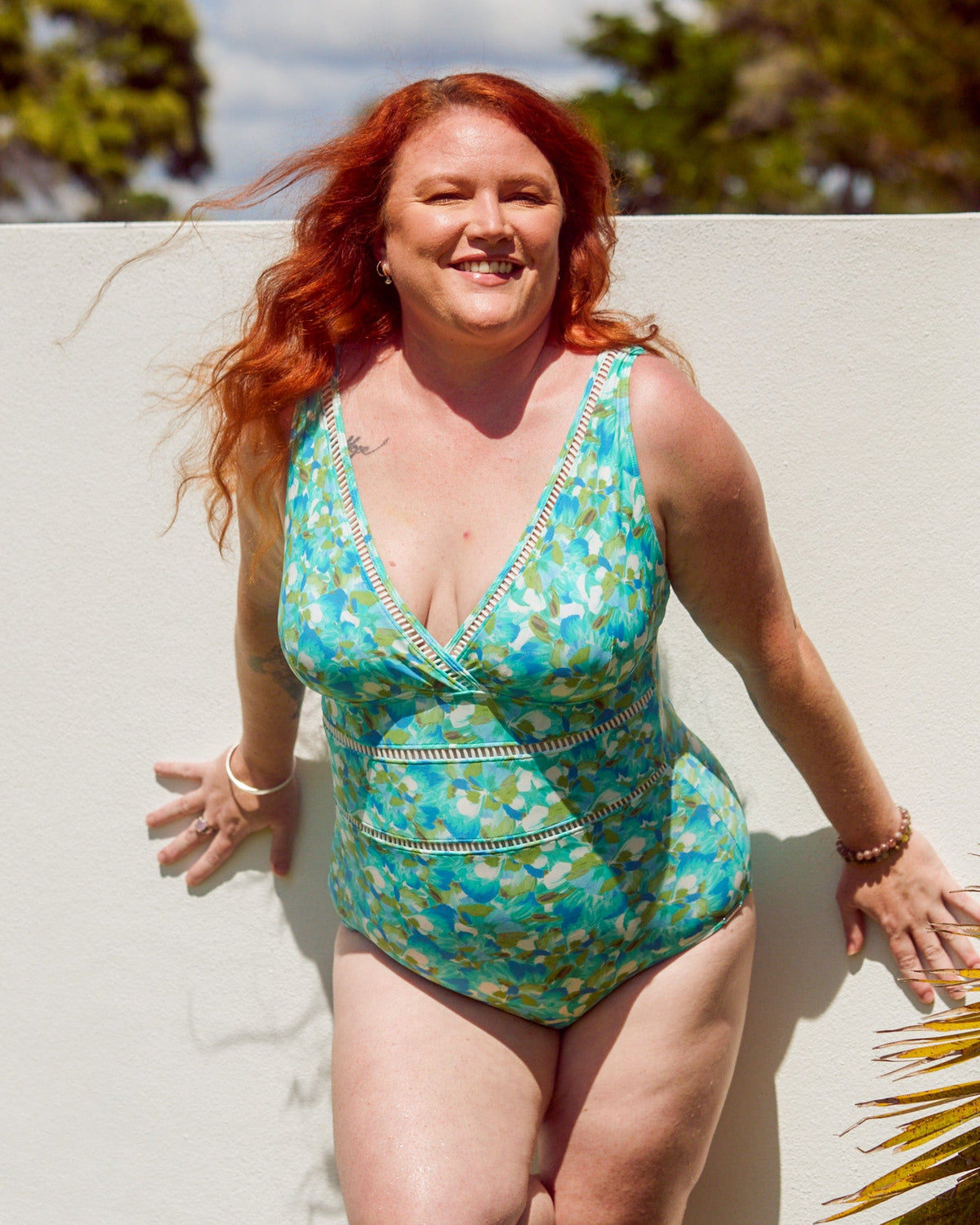 The Calypso colour palette looks sensational against Shannon’s gorgeous skin tone and stunning red hair. The V neckline is ideal for Shannon and the ladder detail creates a waist and beautiful silhouette.