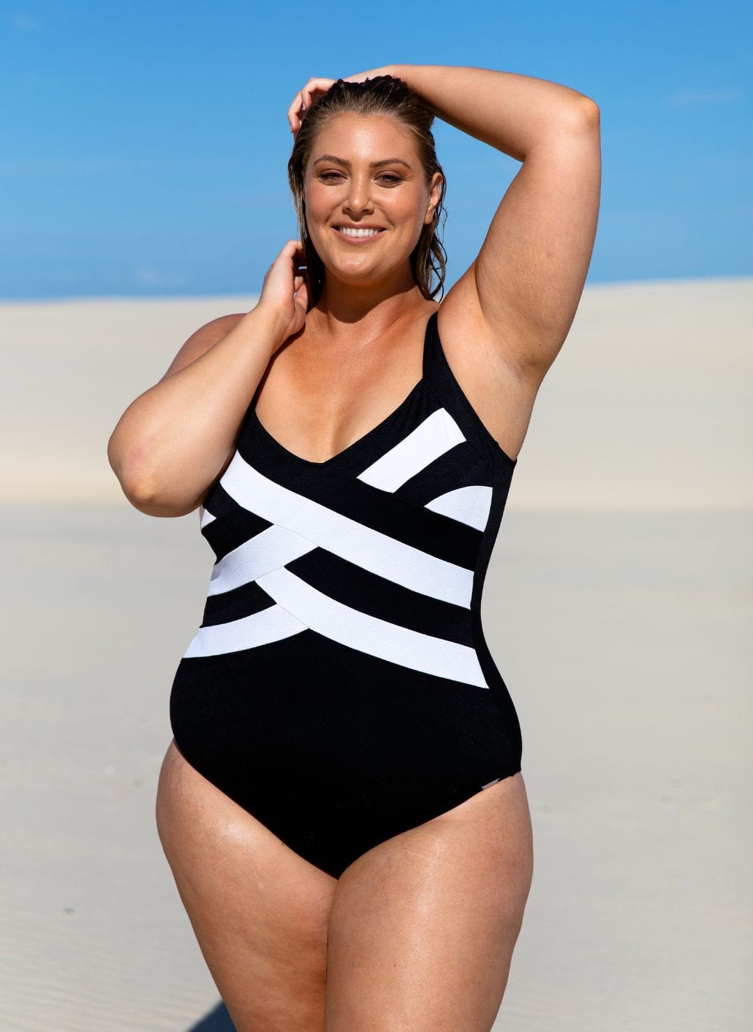 The Acapulco Criss Cross offers similar benefits with slightly different features. This textured swimsuit uses ribbons of black and white that criss cross over the bust. The Acapluco fabric is firmer fitting, providing a supportive fit for your bust, prosthetics, and midsection. The criss cross detail minimises the appearance of your bust if you feel self-conscious about this area. You can also wear this style with or without prosthetics.