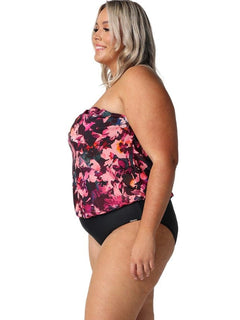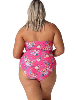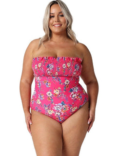 Woman wearing strapless bandeau one piece in pink green and white floral print for curve woman