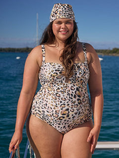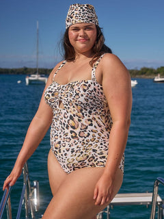 Brunette plus size model on beach wearing a flattering bandeau one piece with removable straps in bright colours