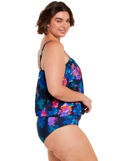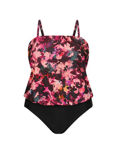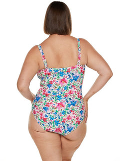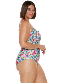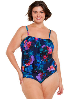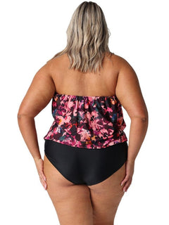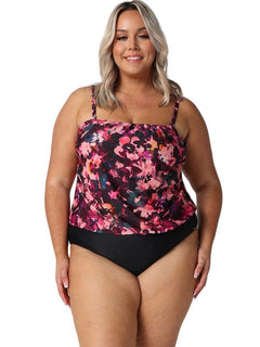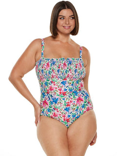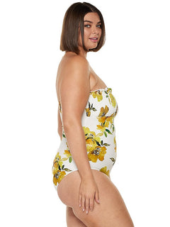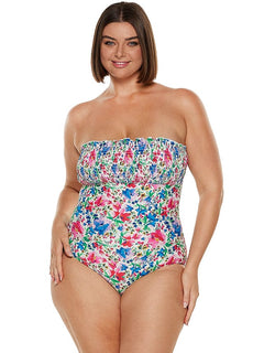 Plus size model wearing twist front floral bandeau one piece with removable straps