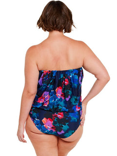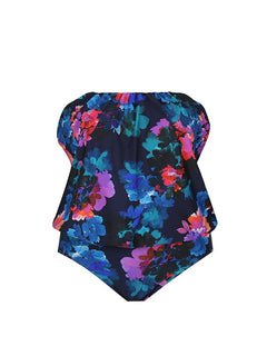Ghost mannequin of flouncy bandeau swimsuit with removable straps in navy based floral print