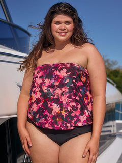 Brunette model on boat wearing plus size flouncy bandeau one piece in pink floral print