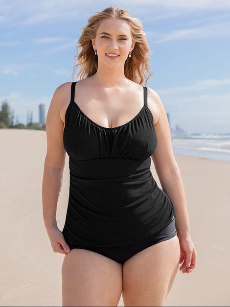 size 16 women standing wearing supportive underwire tankini top in textured black and white fabric