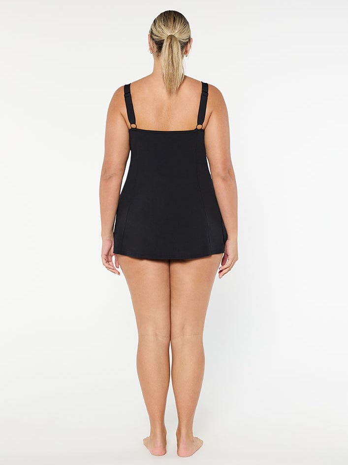Your favourite swim dress style is now available in a new design. The Chlorine Resistant Black Wide Strap Swim Dress features the same dress design and shelf bra support, but without the built-in pant. Enjoy the coverage and support of the original swim dress with the convenience of a two-piece. Similar to a long line tankini, you can choose to wear your swim dress with your preferred chlorine resistant swim pant.