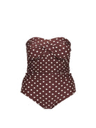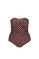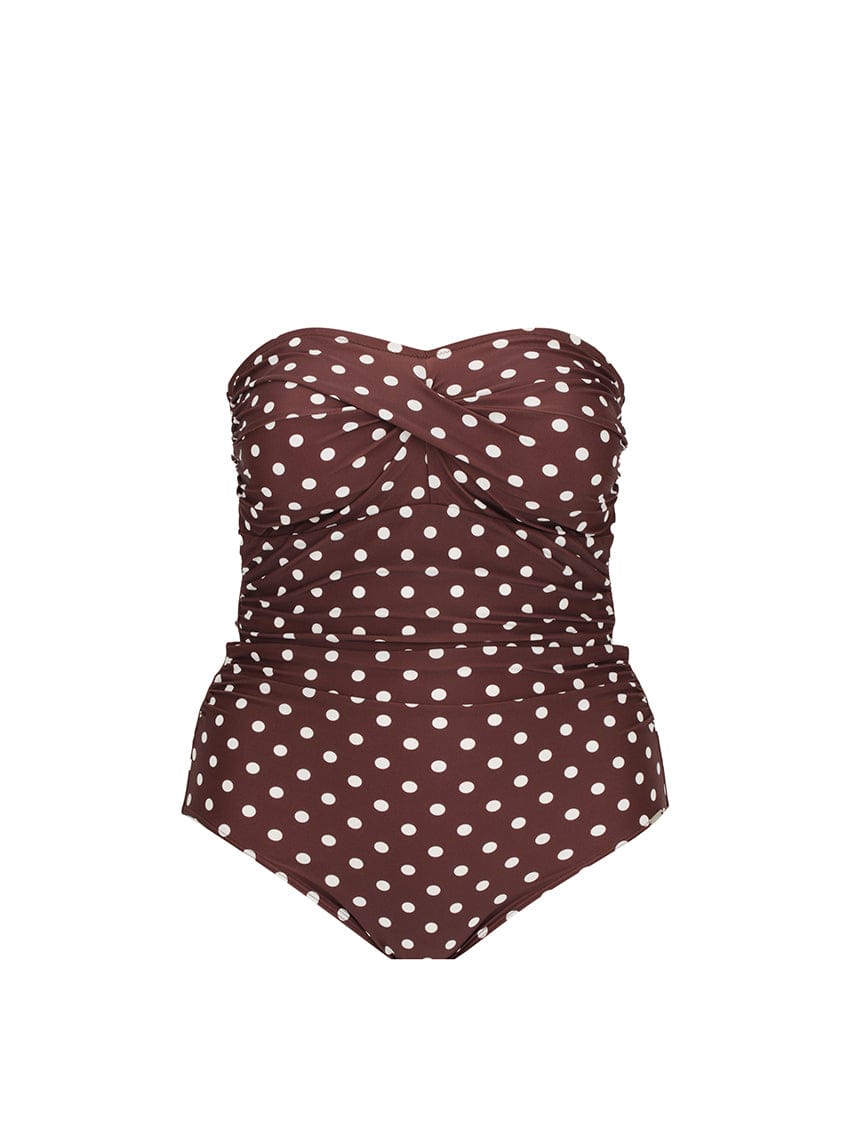 Our Chocolate Polka Dot Twist Front Bandeau One Piece is designed to shape and support your body with its flattering twist-front design and tummy control. This retro-inspired plus-size strapless one piece is made with curves in mind, so you can feel confident and stylish when lounging poolside. Wear this versatile one piece with or without straps and enjoy superior bust support up to a G cup.