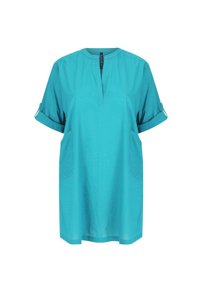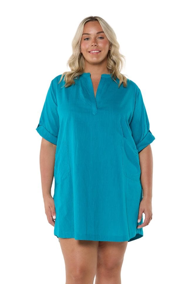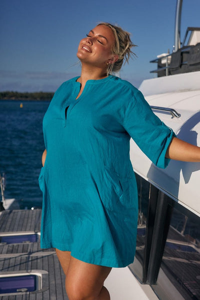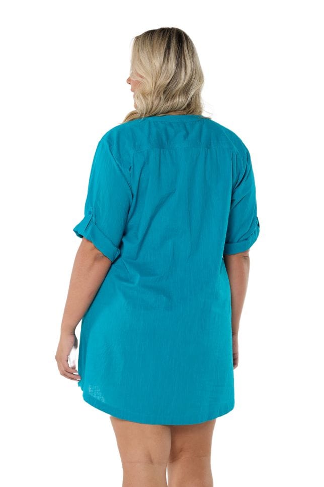 The Ocean Cotton Over Shirt, made from 100% cotton, is a breezy beach cover-up that's both practical and stylish. Its adjustable roll-up sleeves with button detail and handy side pockets make it a must-have for the beach. This versatile over shirt comes in the beautiful blue/green Ocean shade and is lightweight and breathable in the heat.