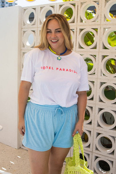 Woman wearing a white 'Hotel Paradise' t-shirt and light blue shorts standing in front of a decorative wall.