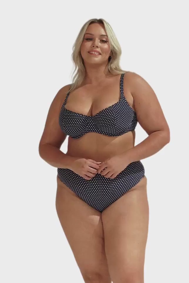Our Navy and White Dots Underwire Bikini Top is our most supportive bikini for bigger busted ladies. Featuring support for D/DD, E and F/G cups with adjustable straps, you can create the most comfortable fit. This underwire bikini top provides exceptional lift and support for fuller busts, making it perfect for active beach days or poolside lounging.